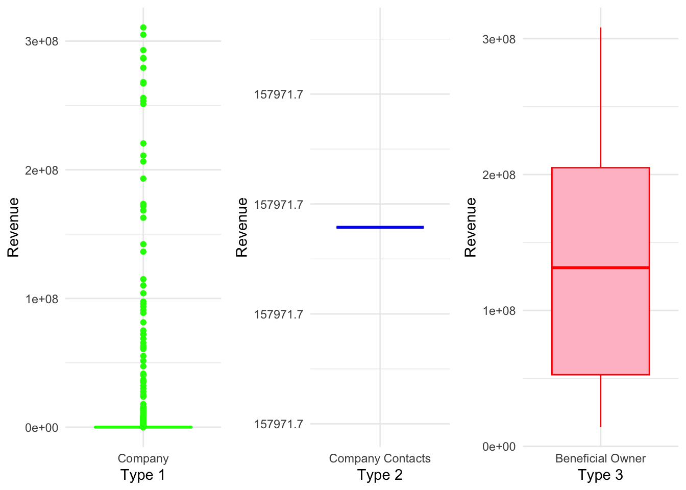 Revenue Variations: The boxplots showcasing revenue distribution for each business type highlighted variations among them. Companies exhibited a wide range of revenue values, including outliers with significant revenue levels. In contrast, company contacts had a single observation with a relatively high revenue, indicating a distinct category. Beneficial owners showed a narrower range of revenue values, suggesting a more focused revenue distribution.