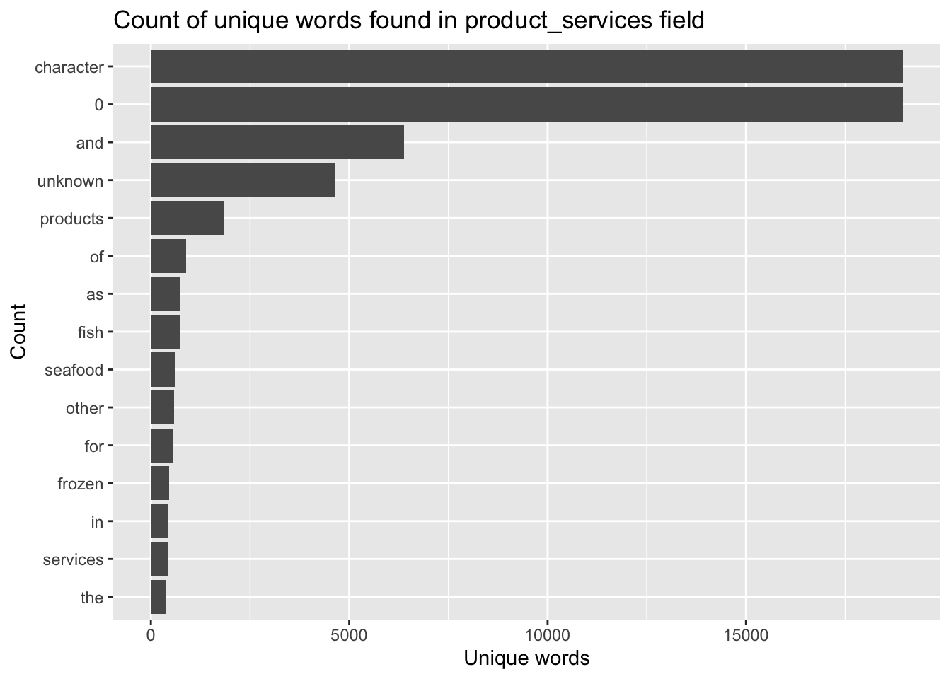 product_services)The two basic arguments to unnest_tokens() used here are column names. First we have the output column name that will be created as the text is unnested into it (word, in this case), and then the input column that the text comes from (product_services, in this case).