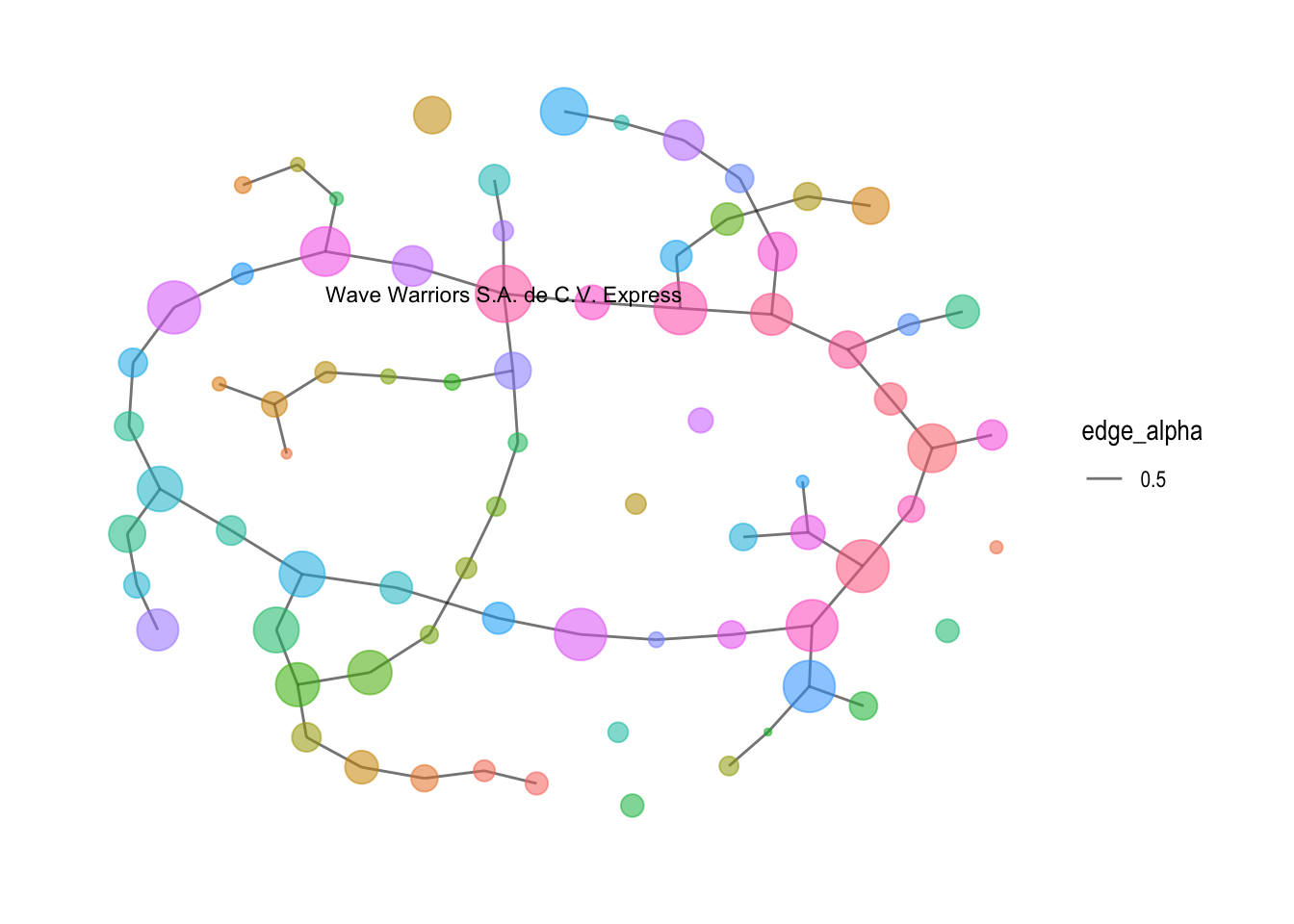 Below network graph labels the nodes with more than 3 edges, which there is only 1, the “Wave Warriors S.A. de C.V. Express”